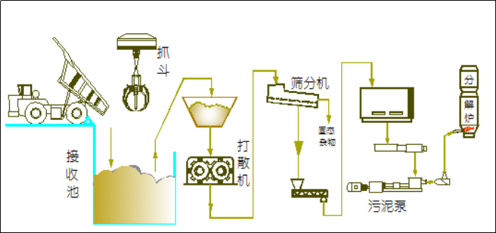半固態廢物配伍后,卸入半固態廢物接收坑,再由抓斗抓入打散機進行打散,打散后的物料經篩分機將其中的固態雜物和大塊物料篩除,少量篩上物料另行處置。篩下物料(漿狀物料呈污泥狀)由螺旋輸送機輸送至污泥倉。倉內漿狀物料由膏體泵輸送至窯尾高溫焚燒,系統配置除雜器,入窯口配置污泥噴槍。