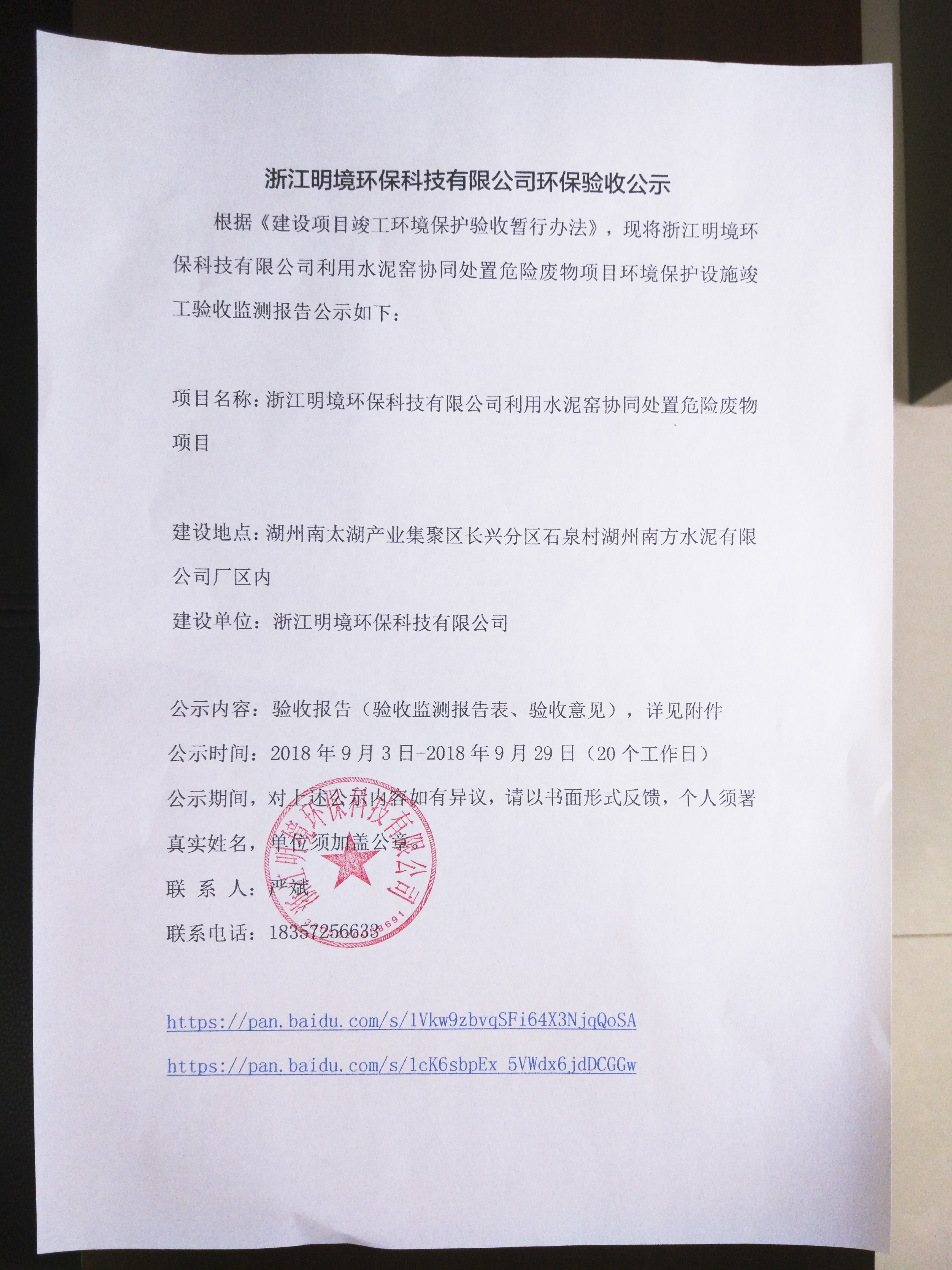 根據《建設項目竣工環境保護驗收暫行辦法》,現將浙江明境環保科技有限公司利用水泥窯協同處置危險廢物項目環境保護設施竣工驗收監測報告公示如下:
